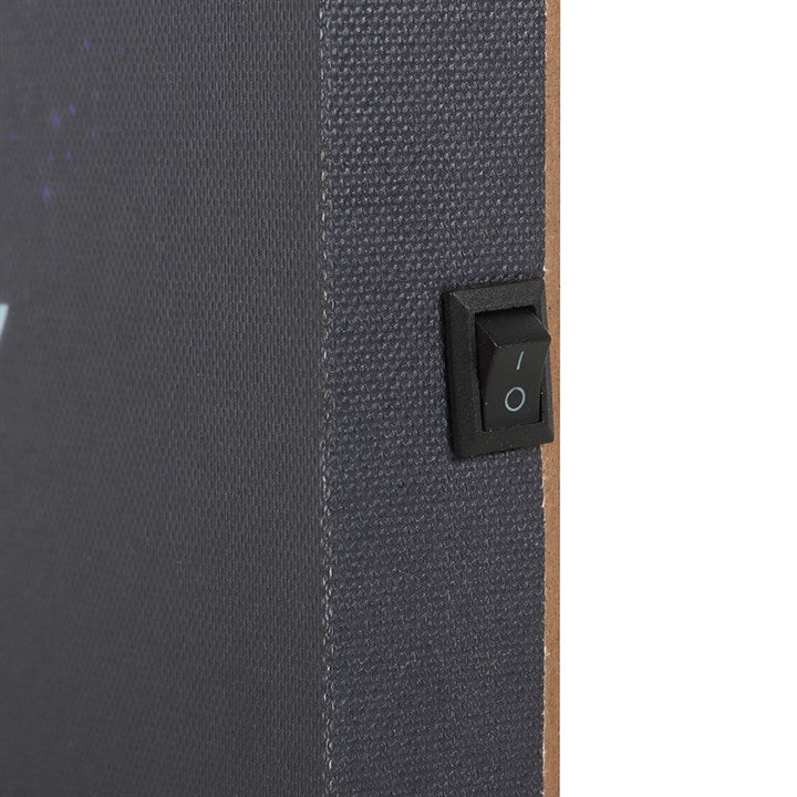 Add a touch of magic to your space with this 30x30cm light-up wall canvas. Features a mystical moth and plant design with embedded LED lights to create a mesmerizing glow. Please note that the switch is located on the side of the canvas and may be slightly obscured by the packaging upon delivery. Requires 2 x AA batteries. Designed by Something Different Wholesale and part of the Night Flight range of mystical owl gifts and home decor.